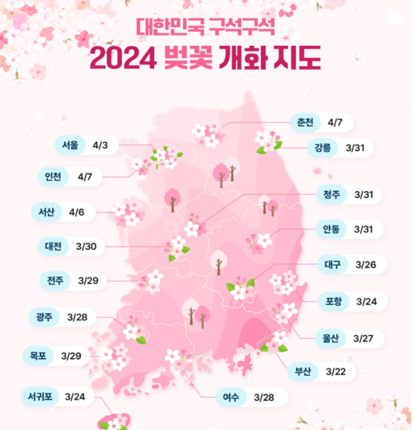 봄이 코앞인만큼 벚꽃 여행을 계획하고 있는 여행자도 많을 것입니다. '2024년 벚꽃 개화 시기'를 한국관광공사가 추천하는 벚꽃 구경하기 여행을 함께해 보겠습니다. 벚꽃은 3월22일 부산을 시작으로 남부지방은 3월 22∼31일, 서귀포는 3월 24일, 중부지방은 3월 30일~4월 7일, 경기 북부와 강원 북부 및 산간지방은 4월 7일 이후에 개화할 것으로 예상됩니다. 벚꽃의 절정 시기는 개화 후 만개까지 일주일 정도 소요되는 점을 고려할 때, 남부지방에서는 3월 29일~4월 7일경, 서귀포는 3월24~4월1일경,중부지방에서는 4월 6~14일경쯤이 될 것이 전망됩니다. 서울은 4월 3일 개화해 4월 10일경 절정에 이를 것으로 보입니다.